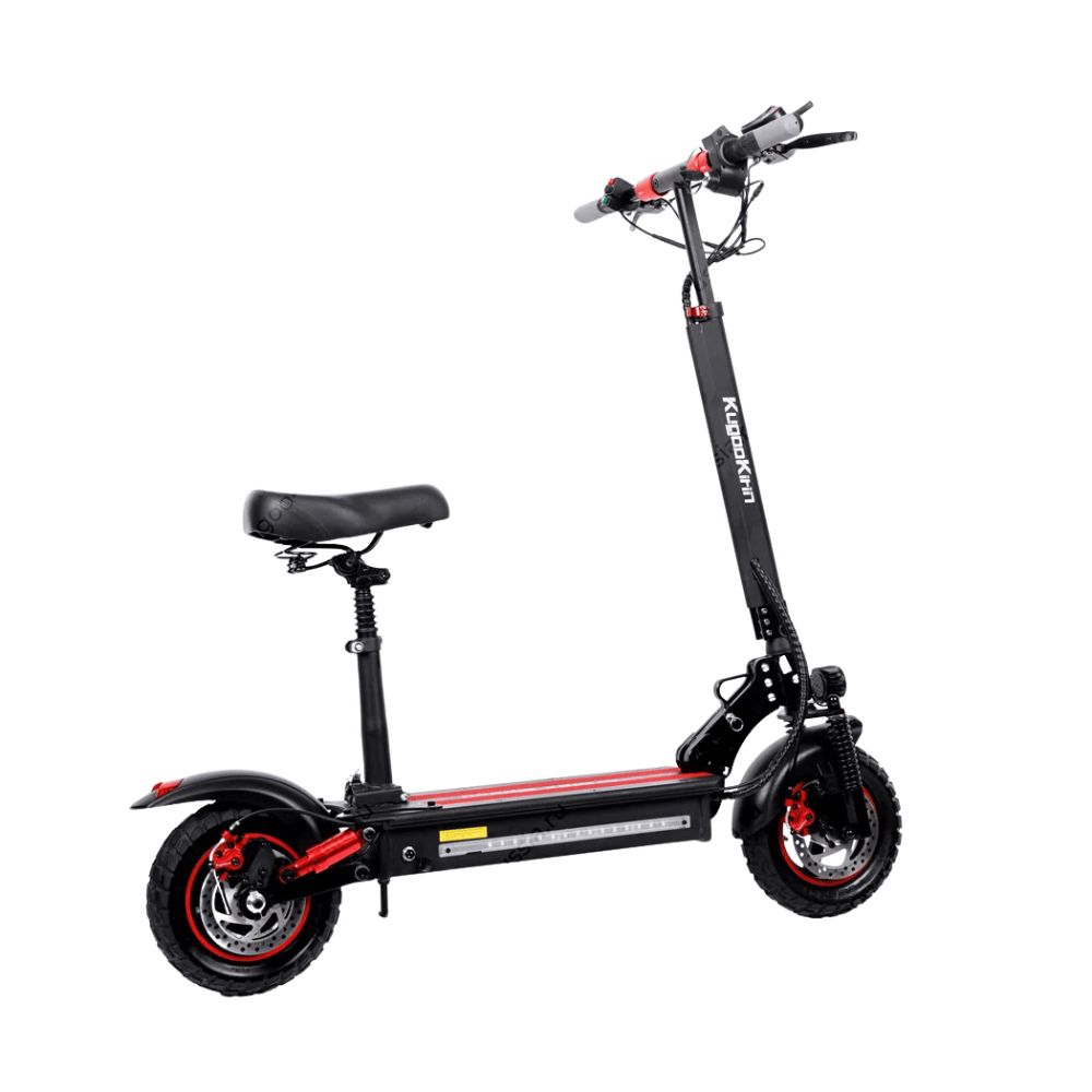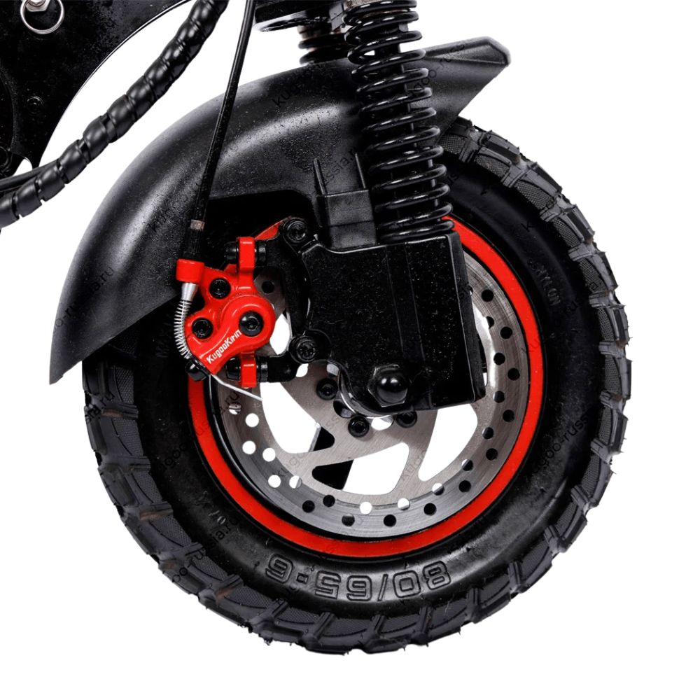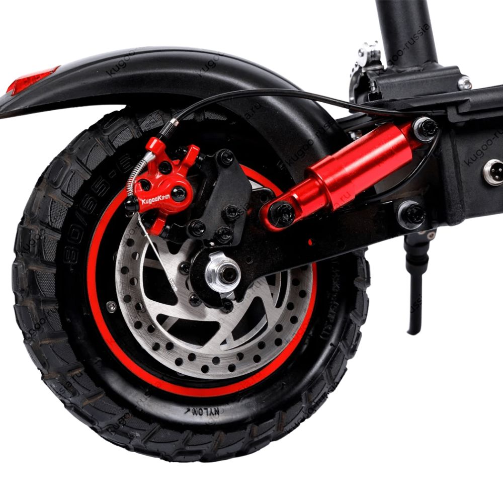 Колеса электрического скутера имеют высоту в 10 дюймов. Новая модель Kugoo после проведенного рестайлинга стала комплектоваться шинами шириной 8 сантиметров с глубоким протектором. На таких колесах не страшно кататься по плохим дорогам. Благодаря широким покрышкам самокат плавно едет даже по плиткам. Диски изготовлены из сплава алюминия, а дека — из авиационного алюминия. По своему виду она ничем не отличается от предыдущей модели.