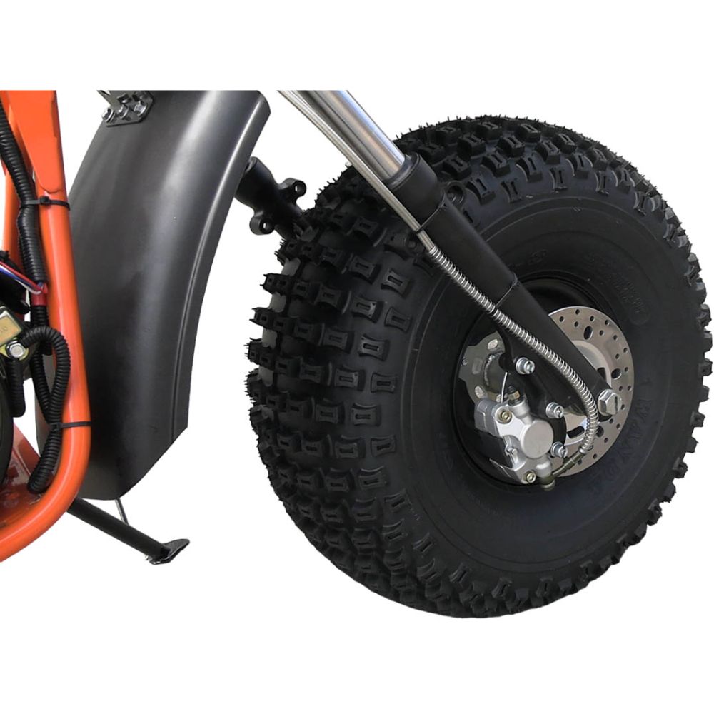 Передняя и задняя подвеска обеспечивают комфортную езду по неровностям и кочкам. Внедорожные широкие покрышки типа GIANT размером 22×11-8" гарантируют отличное сцепление и устойчивость на любом типе покрытия. Дисковые тормоза спереди и сзади обеспечивают надёжное и предсказуемое торможение. В комплектацию входит фара, что делает технику пригодной для передвижения в сумерках и тёмное время суток.