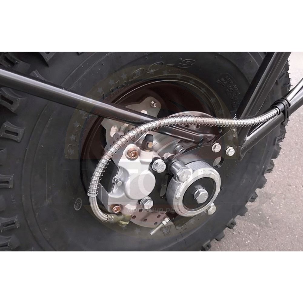 Передняя и задняя подвеска обеспечивают плавную езду даже по неровным дорогам и кочкам. Широкие внедорожные покрышки 22×11-8" дают устойчивость и отличное сцепление на любом покрытии — от песка и грязи до мокрой травы. Задний дисковый тормоз гарантирует надёжное и предсказуемое торможение.