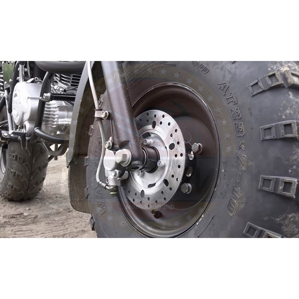 Двигатель объёмом 200 куб. см обеспечивает высокий крутящий момент и уверенную тягу даже на подъёмах или при езде с грузом. Наличие передней и задней подвески гарантирует комфорт на неровных дорогах. Крупные внедорожные покрышки 23×7-10" обеспечивают отличное сцепление и проходимость на грунте, песке и мягких поверхностях.