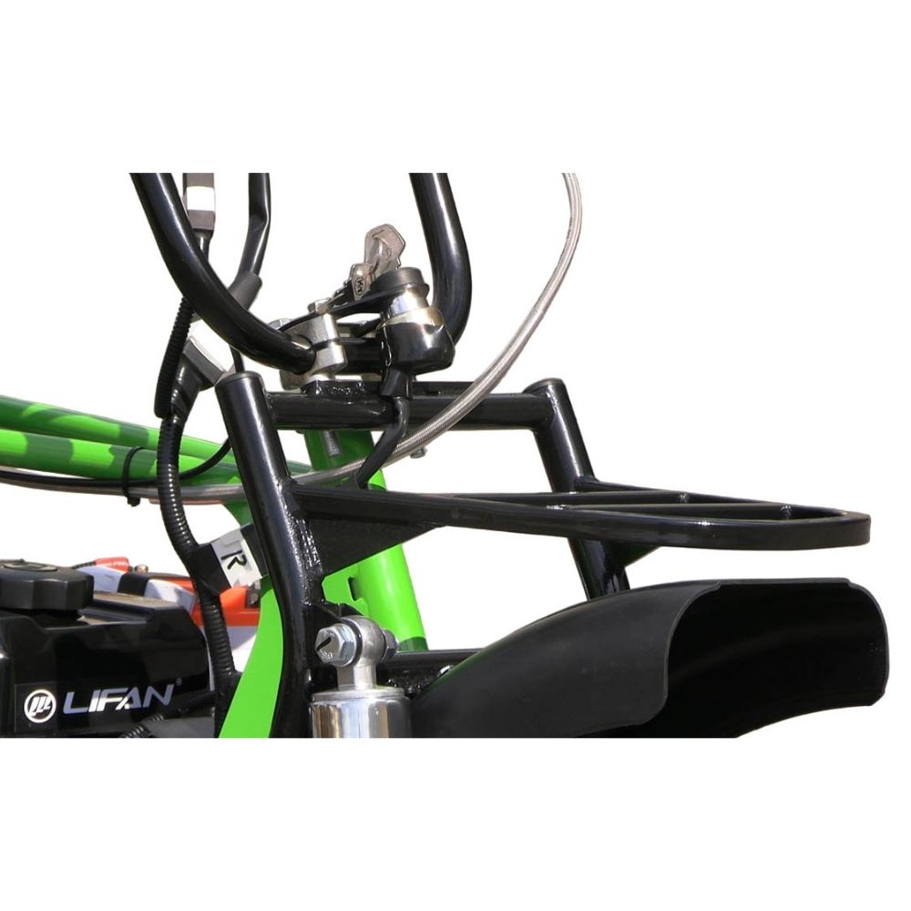 Двухамортизаторная передняя и задняя подвеска обеспечивает комфортное движение, эффективно сглаживая неровности. Покрышки 20×7-8" с глубоким протектором гарантируют хорошее сцепление на рыхлой почве, траве и грязи. Задний дисковый тормоз обеспечивает уверенное и быстрое торможение даже под нагрузкой. В комплектацию включена фара, что позволяет использовать мотоцикл в тёмное время суток или при недостаточной видимости.